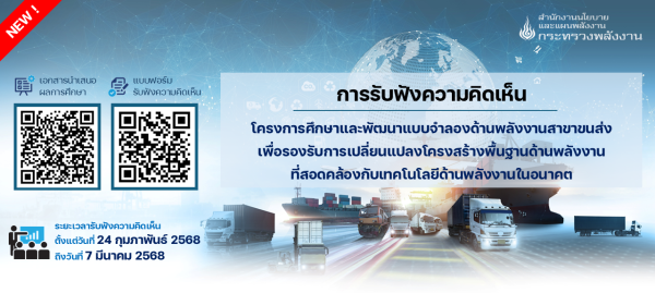 การรับฟังความคิดเห็น โครงการศึกษาและพัฒนาแบบจำลองด้านพลังงานสาขาขนส่งเพื่อรองรับการเปลี่ยนแปลงโครงสร้างพื้นฐานด้านพลังงานที่สอดคล้องกับเทคโนโลยีด้านพลังงานในอนาคต สนพ. เปิดรับฟังความคิดเห็น ตั้งแต่วันที่ 24 กุมภาพันธ์ 2568 เถึงวันที่ 7 มีนาคม 2568 แบบฟอร์มรับฟังความคิดเห็นฯเอกสารประกอบการรับฟังความคิดเห็น By admin|2026-01-21T13:03:03+07:0021 มกราคม 2026|ประกาศเกี่ยวกับการรับฟังความคิดเห็น|0 Comments Share This Story, Choose Your Platform! FacebookXRedditLinkedInWhatsAppTelegramTumblrPinterestVkXingEmail About the Author: admin Leave A Comment ยกเลิกการตอบComment Save my name, email, and website in this browser for the next time I comment.
