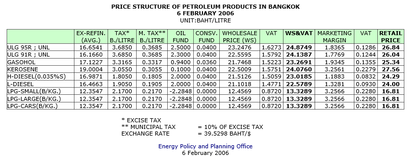 โครงสร้างราคาขายปลีกน้ำมัน 6 กุมภาพันธ์ 2549