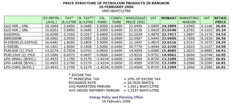 โครงสร้างราคาขายปลีกน้ำมัน 16 กุมภาพันธ์ 2549