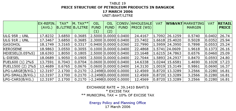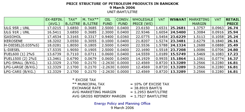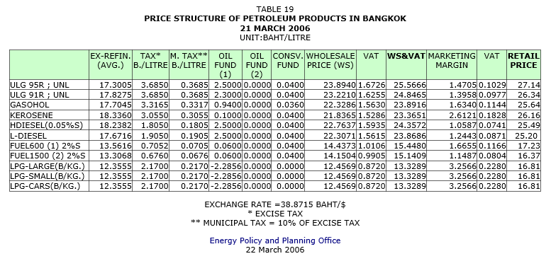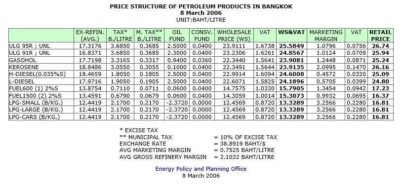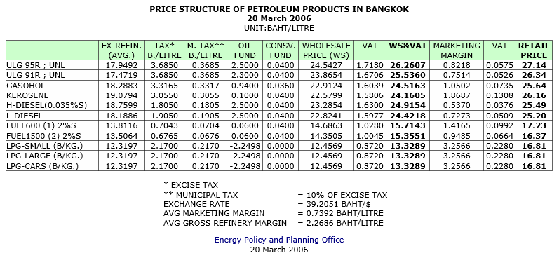 โครงสร้างราคาขายปลีกน้ำมัน 21 มีนาคม 2549