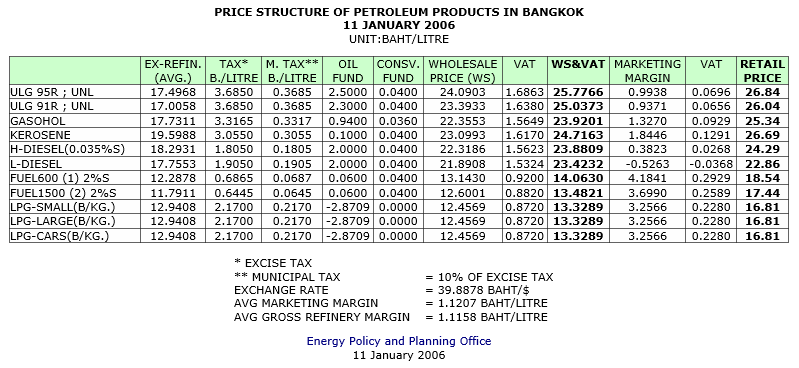 โครงสร้างราคาขายปลีกน้ำมัน 11 มกราคม 2549