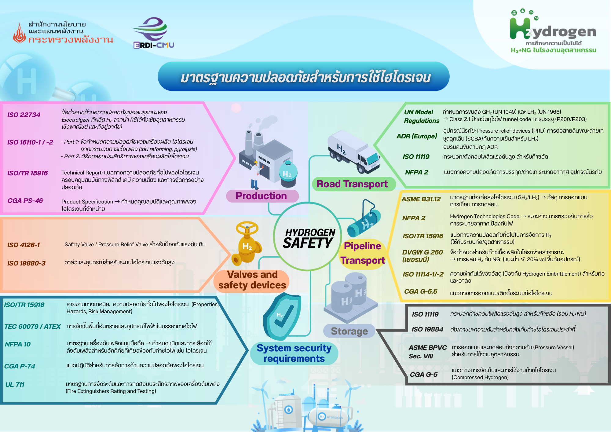 การใช้ไฮโดรเจนในภาคอุตสาหกรรมและการขนส่งจำเป็นต้องมีมาตรฐานความปลอดภัยที่ชัดเจน ครอบคลุมตั้งแต่การผลิต การขนส่งด้วยท่อและทางถนน การจัดเก็บ ตลอดจนข้อกำหนดด้านระบบและความมั่นคงปลอดภัย ดังนี้