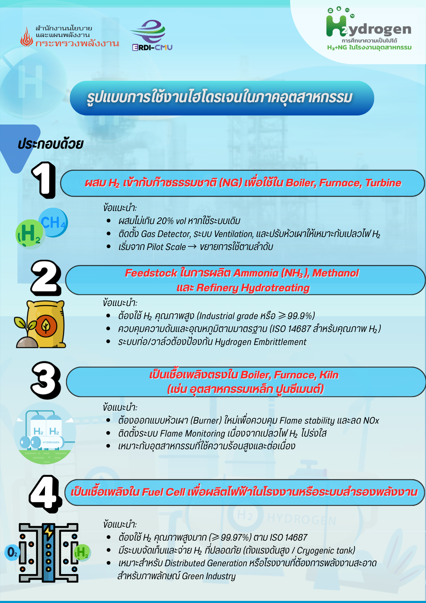 1. ผสมไฮโดรเจนเข้ากับก๊าซธรรมชาติ (NG) เพื่อนำไปใช้ใน Boiler, Furnace และ Turbine โดยแนะนำให้ผสมไม่เกิน 20% vol หากใช้ระบบเดิม พร้อมทั้งติดตั้ง Gas Detector และระบบ Ventilation รวมถึงปรับห้องเผาให้เหมาะกับเปลวไฟไฮโดรเจน โดยควรเริ่มจากการทดสอบในระดับ Pilot Scale ก่อนที่จะขยายการใช้งานในระดับที่กว้างขึ้น